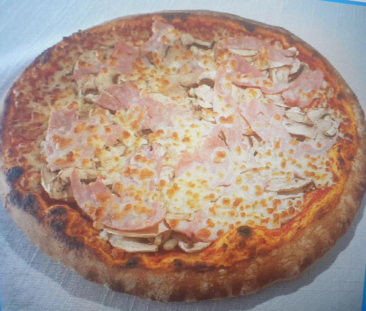 Pâte artisanale cuite au feu de bois,sauce tomate,champignons de Paris frais,jambon blanc,mozzarella.