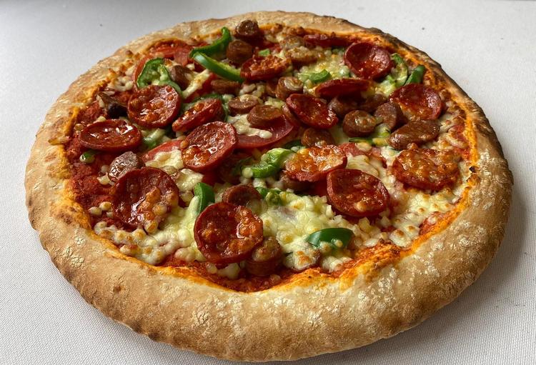 Pâte artisanale cuite au feu de bois,sauce tomate,poivrons,tomates fraîches,chorizo,merguez,mozzarella.