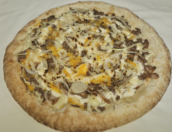 Pâte artisanal cuite au feu de bois, crème , lamelles de kebab , viandes hachées, cheedar, oignons émincées, sauce blanche et mozzarella