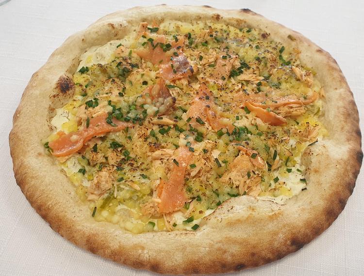 Pâte artisanale cuite au feu de bois,sauce crème fraîche,fondue de poireaux,ciboulette,miettes de saumon frais,saumon fumé,mozzarella.