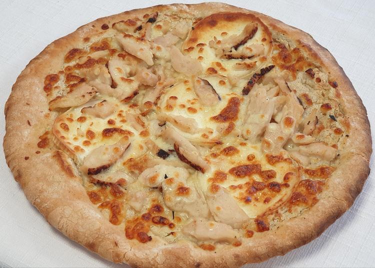 Pâte artisanale cuite au feu de bois,sauce crème fraîche,chèvre,lamelles de poulet rôti,miel,mozzarella.