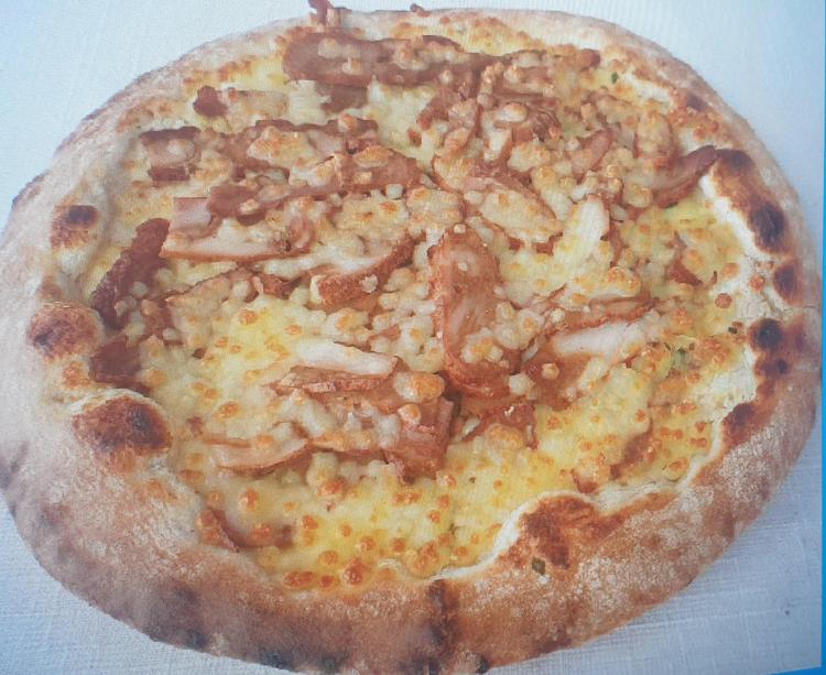 Pâte artisanale cuite au feu de bois,sauce crème fraîche,lamelles de poulet rôti,camembert,sauce curry,mozzarella.