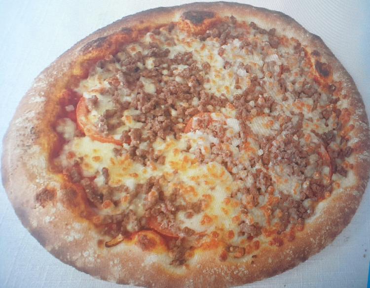 Pâte artisanale cuite au feu de bois,sauce tomate,oignons,comté, tomates fraîches,viande de bœuf hachée,sauce burger ,mozzarella.