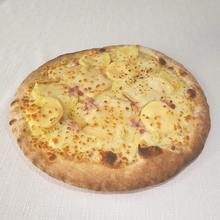 Pâte artisanale cuite au feu de bois,sauce crème fraîche,pommes de terre,oignons,lardons,fromage à raclette,reblochon,mozzarella.