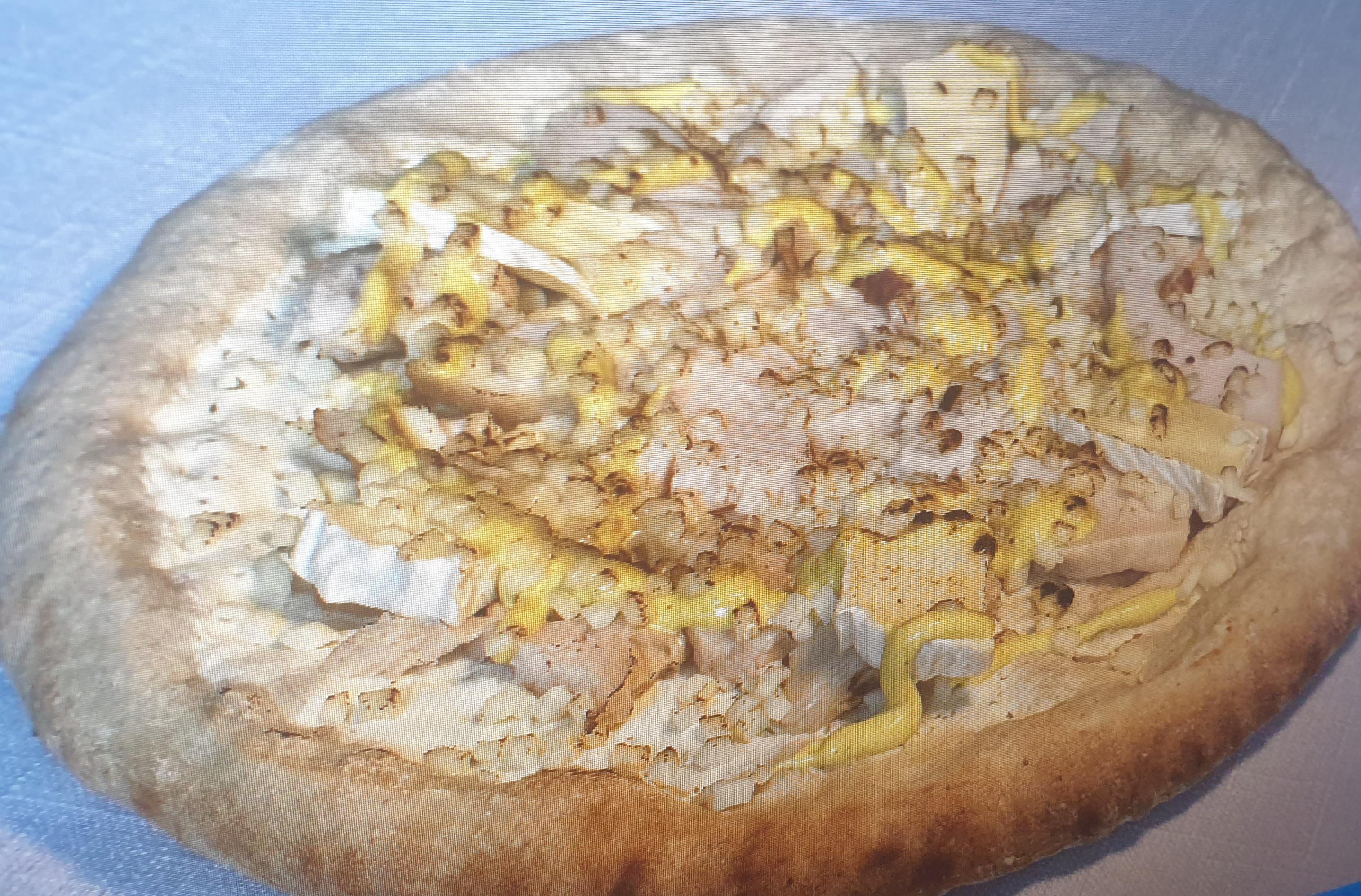 Pâte artisanale cuite au feu de bois,sauce crème fraîche,lamelles de poulet rôti,camembert,sauce curry,mozzarella.